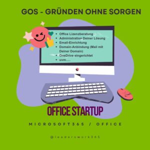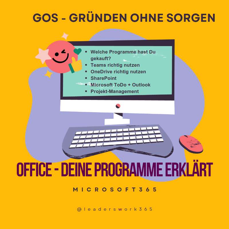 GOS – Gründen ohne Sorgen! Du hast Dir Microsoft365 gekauft? Prima! Dann zeigen wir Dir in diesem 60 Minuten Workshop welche Programme du zur Verfügung hast und was Du damit alles machen kannst. Wir haben dazu ein Beispiel gewählt, dass so auch in der Praxis zu finden ist. Wir zeigen dir startend mit Teams über Word, PowerPoint und deren Metadaten, zu geteilten Dateien in OneDrive bis hin zu Outlook-Sendeptionen und Bing – Deiner ganz persönlichen Office-Suchmaschine. Projektmanagement, Sharepont und Planner sagen Dir nichts? Sehr gut – dann besuche unseren Workshop.